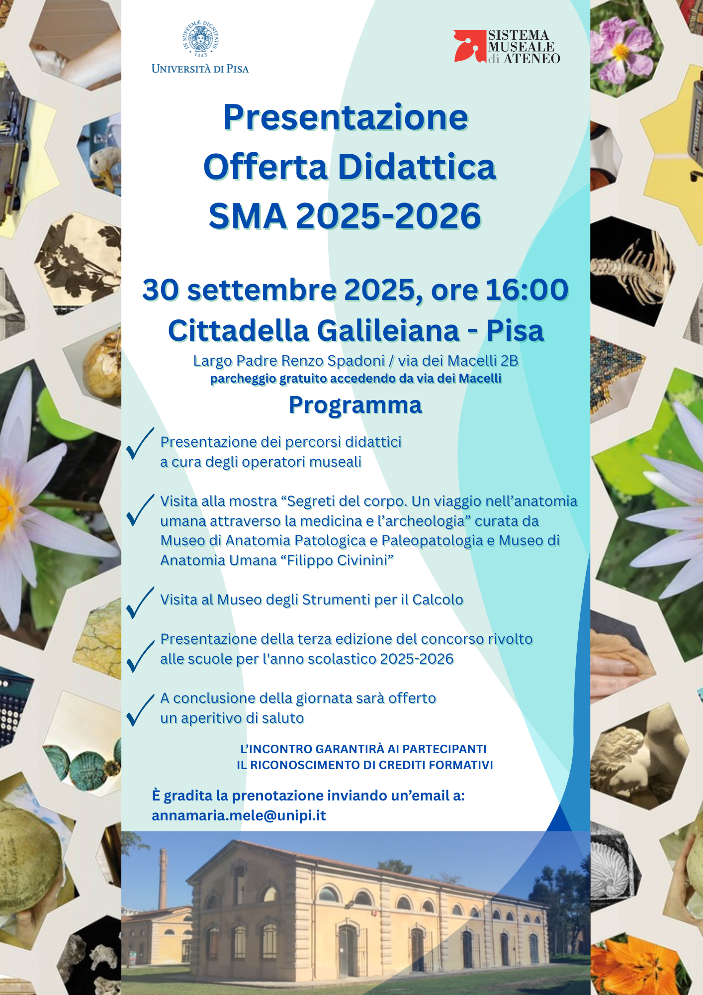 Martedì 30 settembre 2025, alle ore 16:00 presso la Cittadella Galileiana di Pisa (via dei Macelli, 2B /via Nicola Pisano, 25 – Largo Padre Renzo Spadoni), in Aula A1 si svolgerà la presentazione dell’Offerta Didattica del Sistema Museale di Ateneo dell’Università di Pisa per l’anno scolastico 2025-2026.