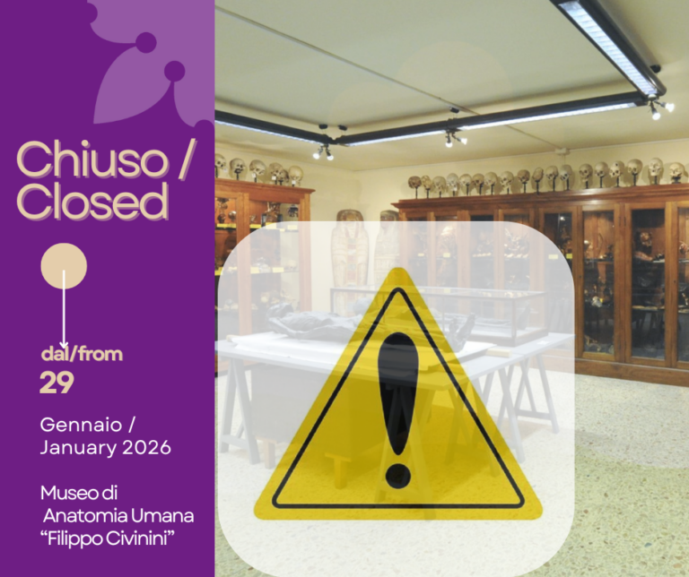 Il Museo di Anatomia Umana “Filippo Civinini” è chiuso per restauro. Ci scusiamo per il disagio e vi invitiamo a monitorare il nostro sito web e i canali social per aggiornamenti. In attesa della riapertura invitiamo a visitare il museo con il tour virtuale Ricordiamo inoltre che parte della collezione è in esposizione presso la … Leggi tutto Museo chiuso per restauro